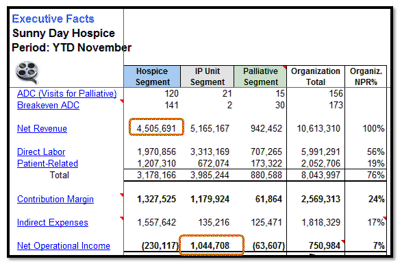 This represents the Net Revenue (Loss) of each listed item as a percent of Hospice Homecare Net Revenue.